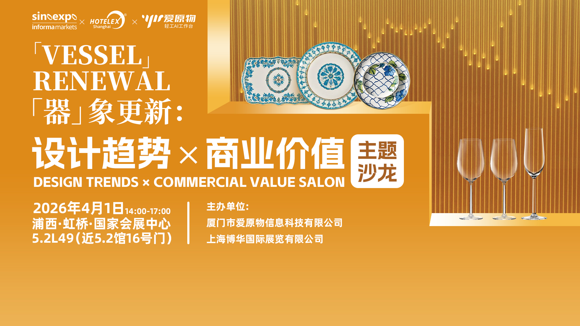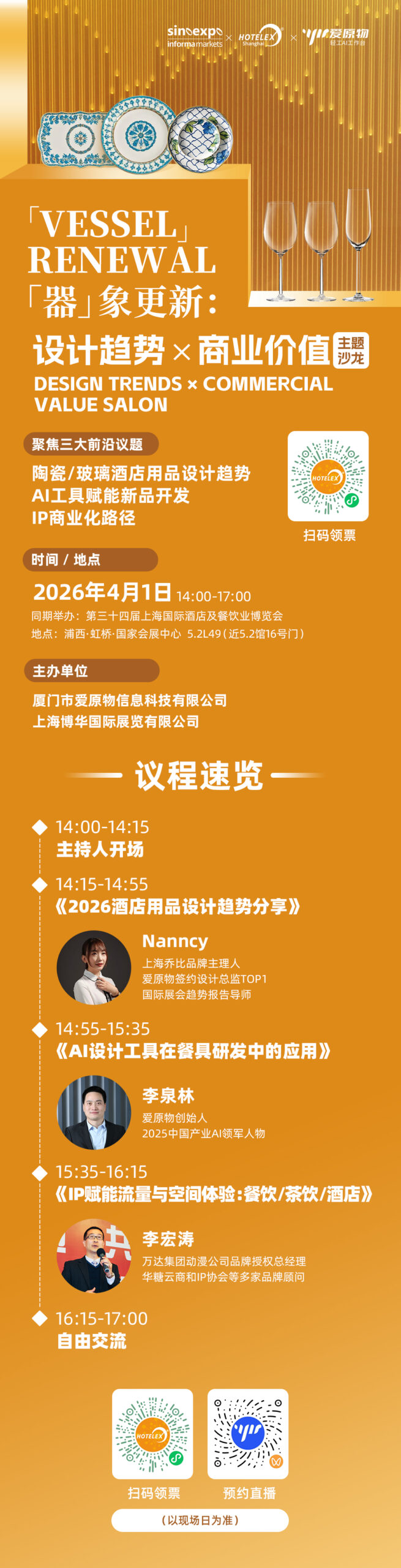 “器”象更新:设计趋势×商业价值主题沙龙,聚焦陶瓷/玻璃酒店用品设计趋势、AI工具赋能新品开发、IP商业化路径三大前沿议题,邀请餐具设计师、桌面展商、KOL共话设计美学与商业落地的平衡之道,揭秘2026-2027年行业增长