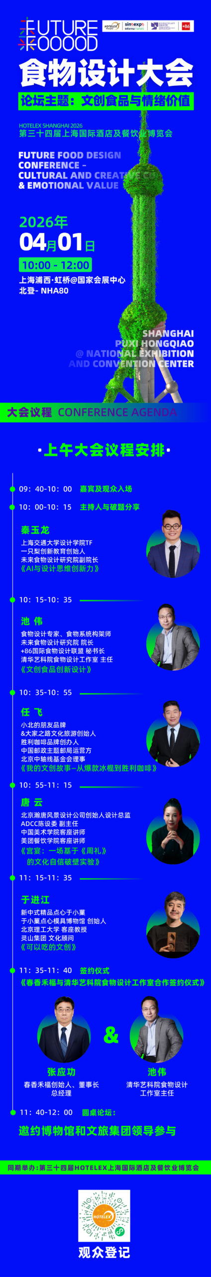 在此背景下,一场聚焦“文创食品”与“情绪价值”的行业盛会——2026 Future Food食物设计大会,将于4月1日在上海国家会展中心(虹桥)盛大启幕!