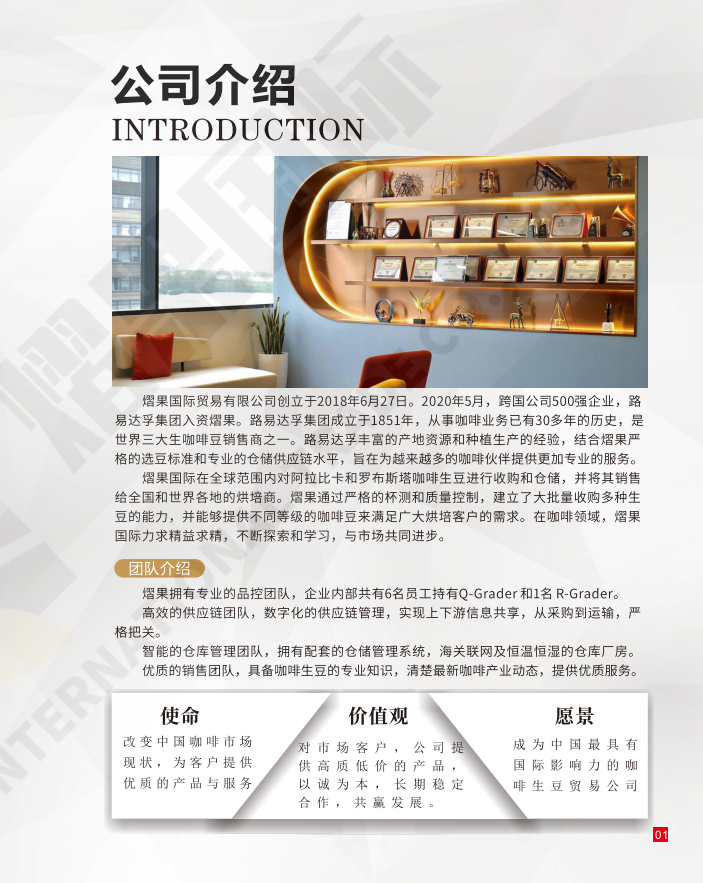 同时,本公司拥有由6位Q-Grader 和1位 R-Grader组成的专业品控团队;高效的供应链团队全部实现数字化管理,从采购到运输,严格把关;销售团队均具备专业的咖啡生豆知识,了解咖啡产业动态。采购和质检方面,熠果国际从产地和终端直采,覆盖全球85%的生产和主要目的地市场,路易达孚集团与熠果团队在源头进行质量把关,双重交叉检查,严格把关出口和进口货物品质。专业的团队在源头进行质量把关,双重交叉检查,严格把关出口和进口货物品质。专业的团队只为了提供更专业、更高效、更贴心的咖啡生豆产品和供应链服务。
